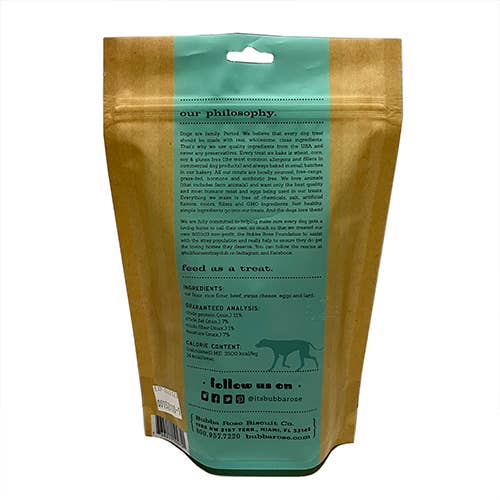 Who doesn't love a good cheesesteak? And these beef and swiss biscuits will have your dog begging for more. One of our best selling flavors and you can feel good knowing that we care about farm animals as much as dogs and we only use free-range, grass-fed beef in our treats. They come in our resealable zipper bags for convenience. Bag Size: 6.5 oz. (treat size 1.25" - 1.75") Average of 45 treats per bag - All Natural & Preservative Free - Healthy & simple ingredients - Wheat, corn, soy & gluten free - A portion of all sales goes to the Bubba Rose Foundation, a 501(c)3 charity to help the local stray dog population Ingredients: oat flour, rice flour, beef, swiss cheese, eggs and lard. Guaranteed Analysis: crude protein (min.) 11%, crude fat (min.) 7%, crude fiber (max.) 1%, moisture (max.) 7% Calorie Content: (calculated) ME: 3500 kcal/kg, 14 kcal/treat