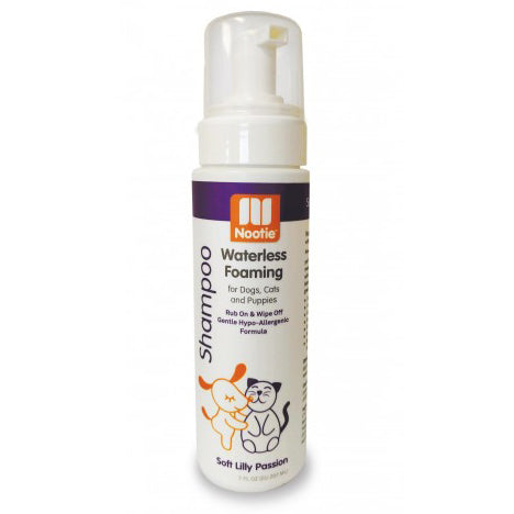 Nootie’s Waterless Foaming Shampoo lightly scented with Soft Lily Passion takes the stress out of bathing! Now it’s easy to freshen up your pet’s coat without the water-splashing mess, just rub on and wipe off. Our gentle hypo-allergenic formula is safe for dogs, cats and puppies, leaving their coat clean, soft and smelling great.