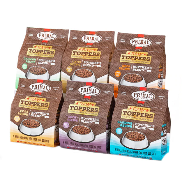 Top off your pet's meal the right way with raw proteins and other great ingredients using our new line pf Primal Butcher's Blend Raw Food Toppers!