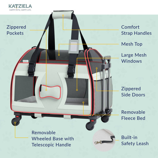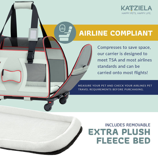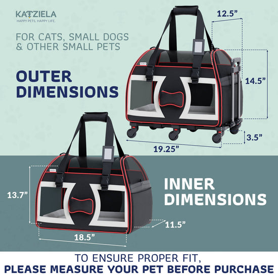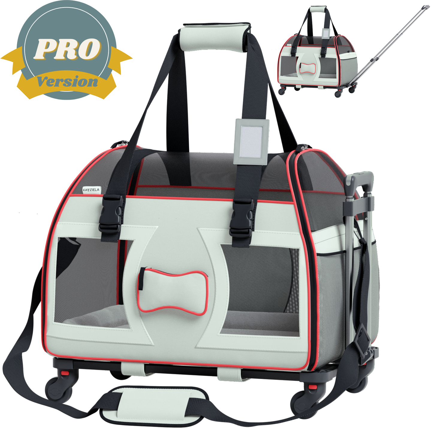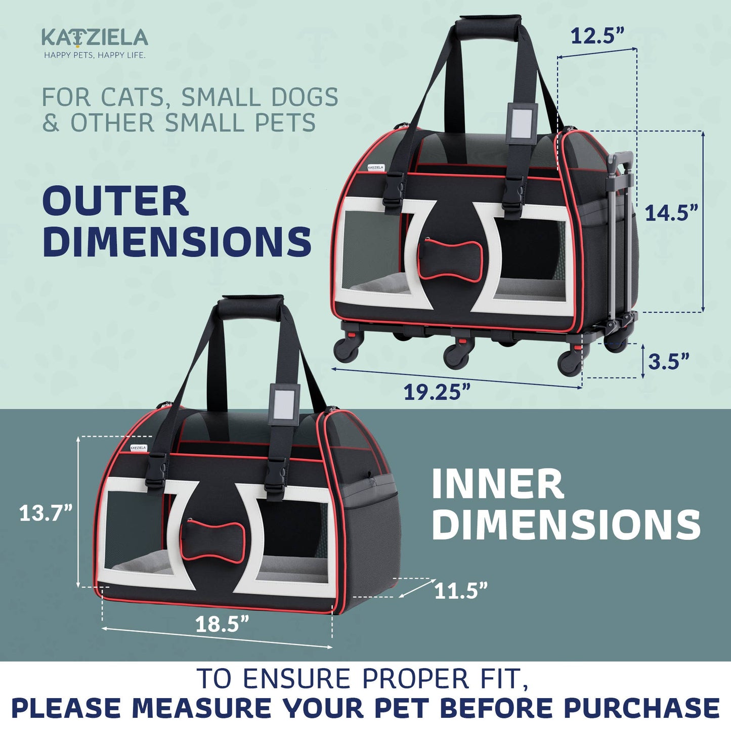 Travel in Style: Bone Cruiser PRO Wheeled Pet Carrier by Katziela *TSA Airline Compliant Pet Carrier. Product Outer Dimensions: 19.25''L x 12.2''W x 14.5''H (Without Wheeled Baseboard) Inner Dimensions: 18.5''L x 11.5''W x 13.7''H Max Weight Supported: up to 22 lbs Give your customers the business class treatment with the Bone Cruiser Pet Carrier. Designed for comfort and convenience, it features a spacious interior and a soft, furry cushioning bed to ensure pet's comfort while traveling. With its double telescopic handle and removable wheels, this carrier is perfect for on-the-go adventures. Katziela's Bone Cruiser Pet Carrier meets airline requirements, prioritizing pet’s safety, and comfort.