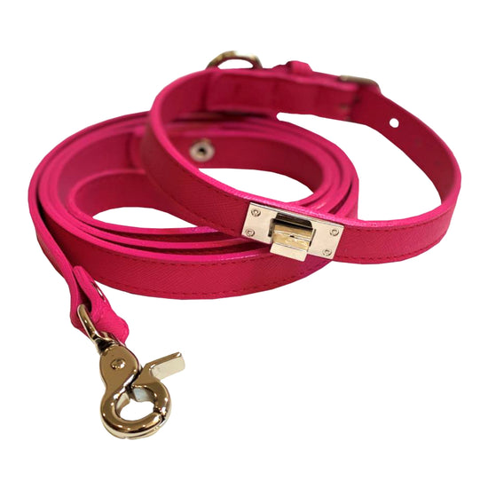 Made for the chic pups, the Charlotte Collar & Leash Sets feature pink textured faux leather and modern clasps for a fashionable look! The collar itself is composed of high quality textured  faux leather with a softer lined interior. Put this set on and add a little pink pop to any outfit!