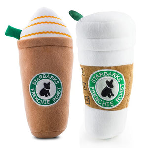 Starbarks refreshments available for all pups big and small! Made of soft plush fabric with a squeaker included inside for added entertainment. The Xtra-Large sizes have an additional mesh lining for durability's sake.