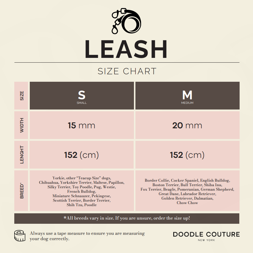 Introducing our newest Secure-In-Place Dog Leash, your ultimate leash upgrade. * Ensures convenience, innovation, and safety for you and your best friend. * Exclusive handsfree buckle handle design keeps your pup secure during any adventure. * Soft neoprene padding for maximum comfort and durability along it's entire adjustable 2'-5' length. * Metal alloy hardware adds style and functionality. * Coordinate your pet's style with matching Doodle Couture accessories. * Available in 10 beautiful colors and two sizes (15mm for small, 20mm for medium). * Make walks stylish and hassle-free with the most convenient and beautiful leash on the market!