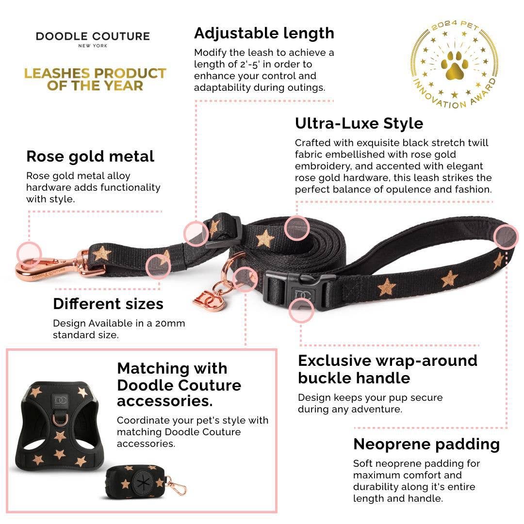 Introducing our newest Secure-In-Place Dog Leash, your ultimate leash upgrade. * Ensures convenience, innovation, and safety for you and your best friend. * Exclusive handsfree buckle handle design keeps your pup secure during any adventure. * Soft neoprene padding for maximum comfort and durability along it's entire adjustable 2'-5' length. * Metal alloy hardware adds style and functionality. * Coordinate your pet's style with matching Doodle Couture accessories. * Available in 10 beautiful colors and two sizes (15mm for small, 20mm for medium). * Make walks stylish and hassle-free with the most convenient and beautiful leash on the market!