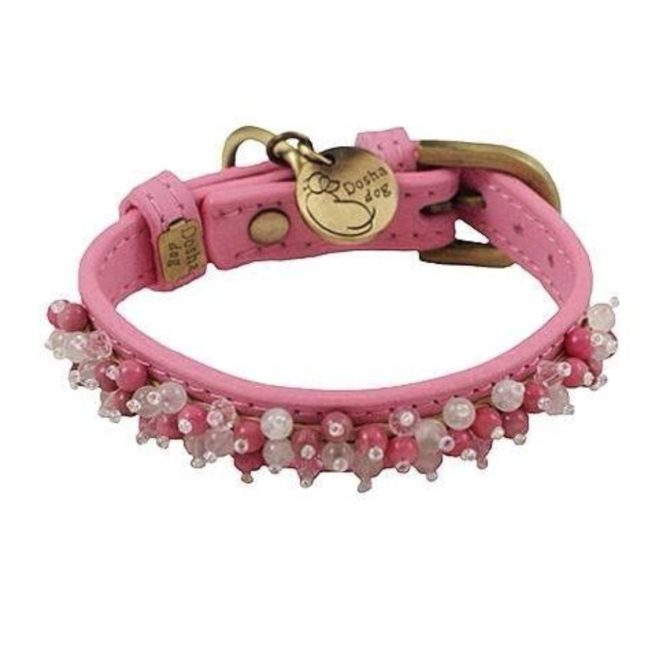 Our Mini Beads series is the petite version of Dosha Dog's signature Beaded Collection. We have made the collar thinner, lighter and softer to better fit smaller dogs, but kept the fancy beaded look. Each gemstone bead is meticulously hand-sewn onto the leather. Materials: Genuine leather, Pink Quartz, brass hardware.