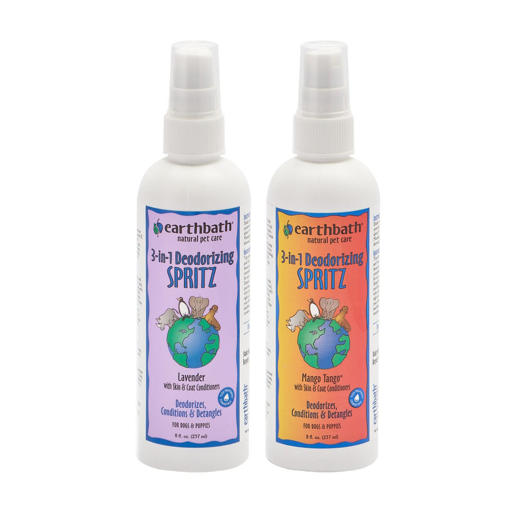 This 3-in-1 Deodorizing Spritz naturally conditions and detangles coats, while deodorizing with the fresh botanical fragrance of lavender oil. Organic aloe vera and vitamin E leave the coat exceptionally soft and bright. Use between baths to freshen, condition and detangle, or as a finishing spray after bathing your dog with Earthbath Coat Brightening Shampoo. Safe for dogs over 6 weeks old. Not for use on cats.