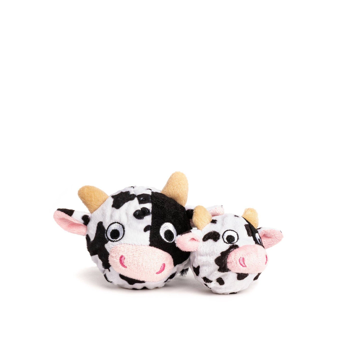 What 's better than a cow 's moooo ? A cow that bounces and squeaks for your dog to play with all day! Let your dog wrangle cattle in their own way with this squeaky cow faball: a rugged bouncy TPR ball covered in soft cotton fabric that your dog can chase around and gnaw on all day! Specs: TPR Squeaker Ball Cotton Fabric Covering Medium:4 "height/width/depth Small: 3 " height/width/depth Spot clean with soap and water