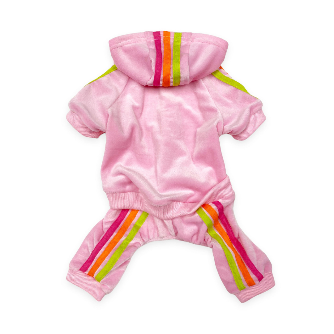 Ready to break a sweat, or just hoping to look the part, your pup will be feeling fit and fabulous in this athleisure wear-inspired ensemble. Sporty stripes and a hood complete the look. 100% Polyester; machine wash, lay flat to dry.