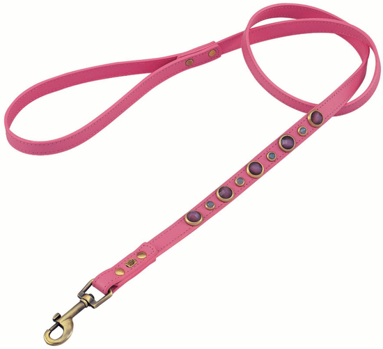 This pink leather dog leash is handcrafted and adorned with pink Cat Eye gemstones creating a fancy accessory that will look stylish on any dog. The Imperial Collection comes in 1 color with complimentary gemstone variations. The hand-carved gemstones are secured onto the leather with brass rivets. Matching collars available and sold separately.