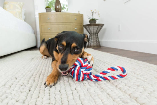 All our Good Karma Rope Toys are hand tied and dyed using non-toxic vegetable dyes. As your dog chews, our rope toys fray and act like doggie dental floss. And at Jax & Bones, we believe in playing it forward, so with every purchase of a Good Karma toy, we donate 10% of the proceeds to rescue and animal welfare groups to help these animals find a forever home. Keywords: Patriot, 4th of July, America, Americana, Patriotic, American Flag