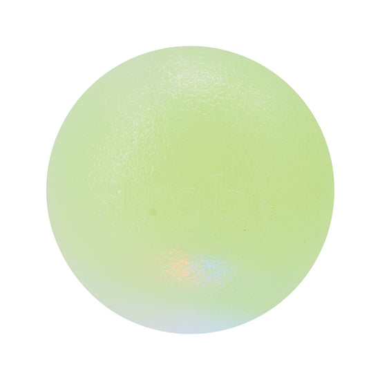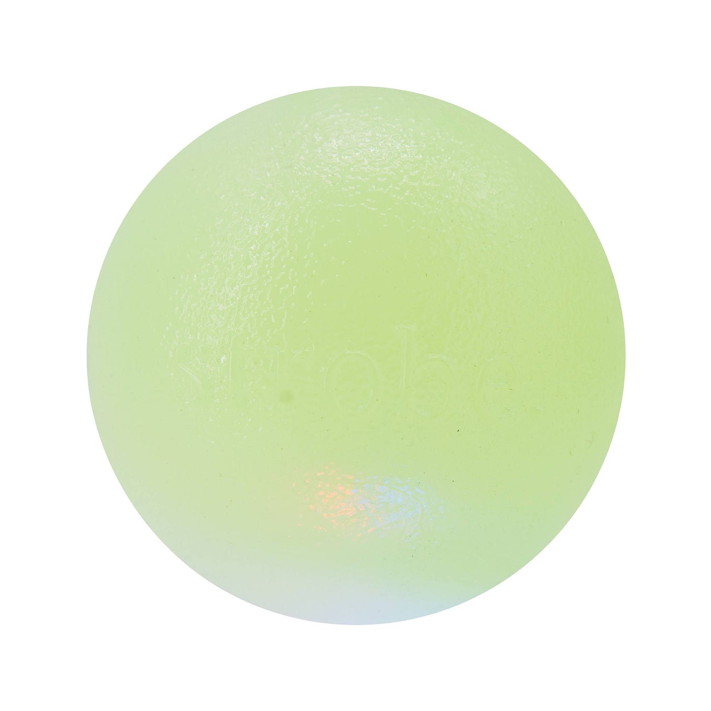 Orbee Strobe Ball Light Up LED Green by Planet Dog Size 3" x 3" This durable interactive ball starts blinking when you bounce it; turning your typical game of fetch into an exciting multi-sensory experience. Once the ball is thrown and hits a firm surface a multi-colored LED light automatically starts blinking. The LED light is embedded with the same impenetrable technology as our award-winning Squeak Ball. The light is tightly and safely enclosed in a non-toxic sleeve that is then embedded into the ball during the molding process. This patent-pending technology requires no glues or adhesives making it 100% non-toxic. The Strobe’s light has a life of 200 hours, that’s over 36,000 throws! And during times of non-lighted activity the ball is still a playtime favorite with a fun texture Strobe scores a 5 out of 5 on the Durability Scale for the most aggressive chewers.