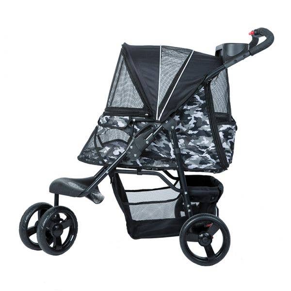 Petique Durable Pet Stroller is so sturdy and well made with its thick frame, large EVA tires and double front wheels, it makes for a smooth and enjoyable ride when walking your dogs, cats, and other animals! It has an additional large storage basket, two large back pockets and a cup holder tray that holds up to two cups! This pet stroller is designed to create a comfortable experience for you and your pets! With quality mesh windows that provide optimal air circulation throughout the stroller, your pets will feel calm, happy and secure.   Features Tested to meet the same requirements as juvenile standards No harmful chemicals Easy one-step double rear brake for optimal safety Two back pockets great for cell phone, keys, treats, etc Convenient cup holder tray that holds up to two cups Large storage basket holds up to 5 LB Fabric can be easily removed for washing Patented pee pad insert Front wheel has the options to lock or do a 360 degree swivel Mesh Windows Supports up to 55 LB