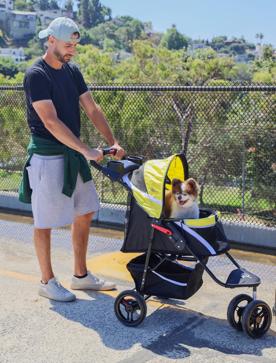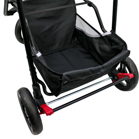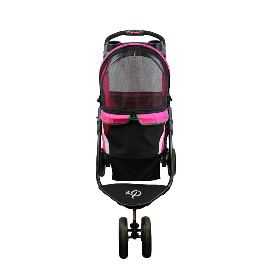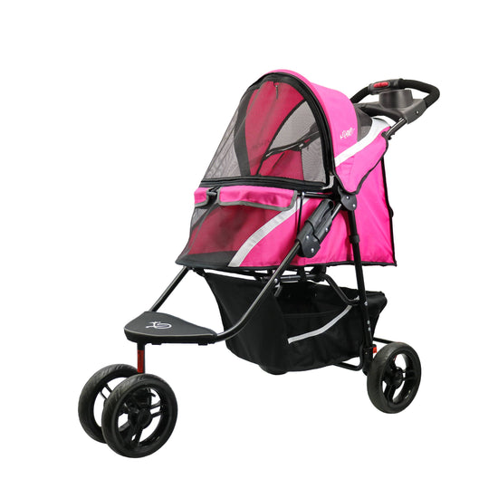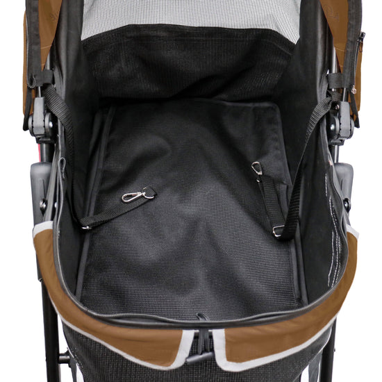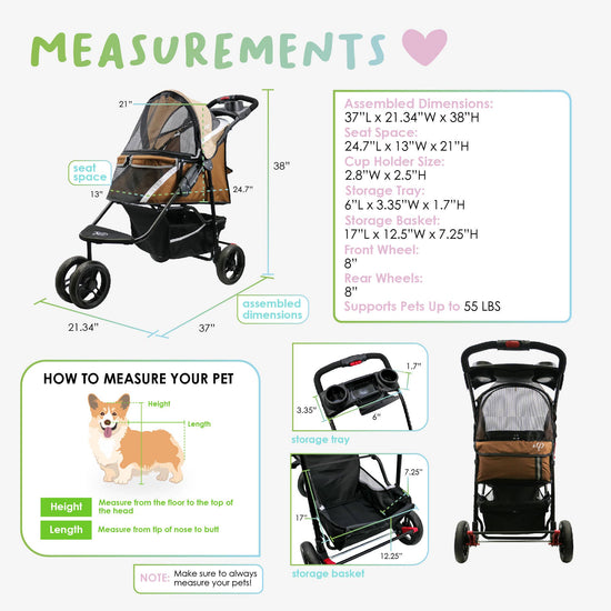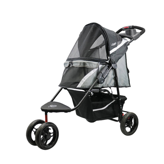 Petique’s Revolutionary Pet Stroller is designed with a built-in shock absorber that provides your pets the safest and smoothest travel for long walks. We added quality mesh windows for optimal air circulation and multiple storage compartments for an enjoyable time with your pets! This includes a spacious undercarriage, a large back pocket, and a cup holder tray that holds up to two cups! As an extra perk to make traveling with your pets even easier, you can fold the stroller completely flat with one hand to create maximum storage for your closet or the trunk of your car! Features Tested to meet the same requirements as juvenile standards * No harmful chemicals Easy one-step double rear brake One large back pocket Convenient and secure cup holder tray that holds up to two cups Large storage basket holds up to 5 LB Patented pee pad insert Front wheel has to lock or do a 360 degree swivel Quality mesh windows Supports pets up to 55 LB Product Dims: 37"L x 21.34"W x 38"H