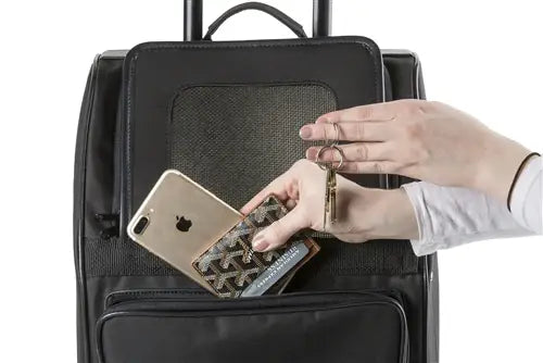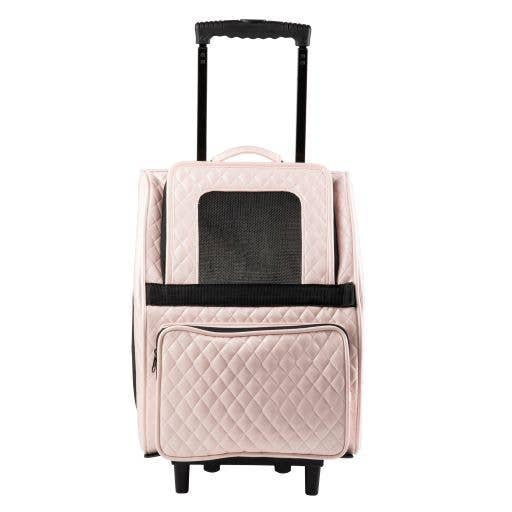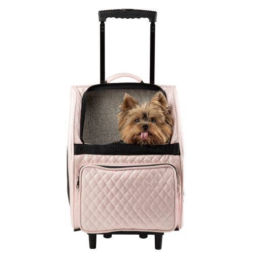 Pink Quilted 3-in-1 Wheel Bag The Petote Pink Quilted Rio Bag, also known as the Petote Traveler Bag, is a great pet carrier on wheels that's perfect for your dog or cat! In addition to being a deluxe pet carrier on wheels, the Pink Quilted Rio Bag also becomes a backpack and a car-seat. The Rio bag is made of durable pink quilted fabric and adorned with pink faux-leather trim. Every Petote Rio Bag also comes with a removable, faux-fur lining that is machine washable. The Rio Bag features plenty of ventilation and an exterior zipper pocket for extra storage. Accommodates pets up to 12 - 15 lbs. Measures 13.75" x 12" x 18.5". Note: The Rio Bag meets most airline requirements. Always check with your airline before flying. Additional Petote Rio Bag Features Include: Telescoping handle Sturdy construction Interior safety strap, padded backpack straps Easy wipe-down interior lining Bag easily removed from the trolley wheel system MADE IN USA
