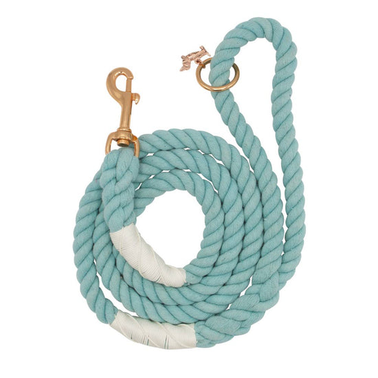 All eyes are on this beautiful rope leash with its stunning hue. Pair with a matching Sassy Woof harness, collar, and waste bag. Description * Solid aqua blue rope * Made with strong, 100% cotton rope and natural dye * Rope is hand-spliced and ends are whipped to add strength & durability * Beautiful luxe rose gold hardware with a matching rose gold dog charm and accessory ring * Rope is 3/5" Thick and 5 feet in length Care Instructions * Hand wash only. Spot clean with soap and water. Hang to dry.  * Gold hardware may fade and develop a patina over time * We do not recommend rough play in these leashes or wearing them in salt water and/or muddy areas * Rope Leashes are hand-dyed so there will be slight variations in color. The color can vary slightly from the color on your monitor screen