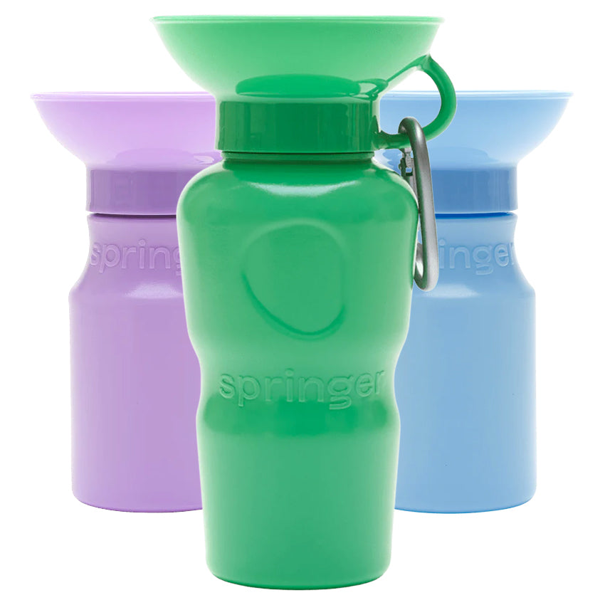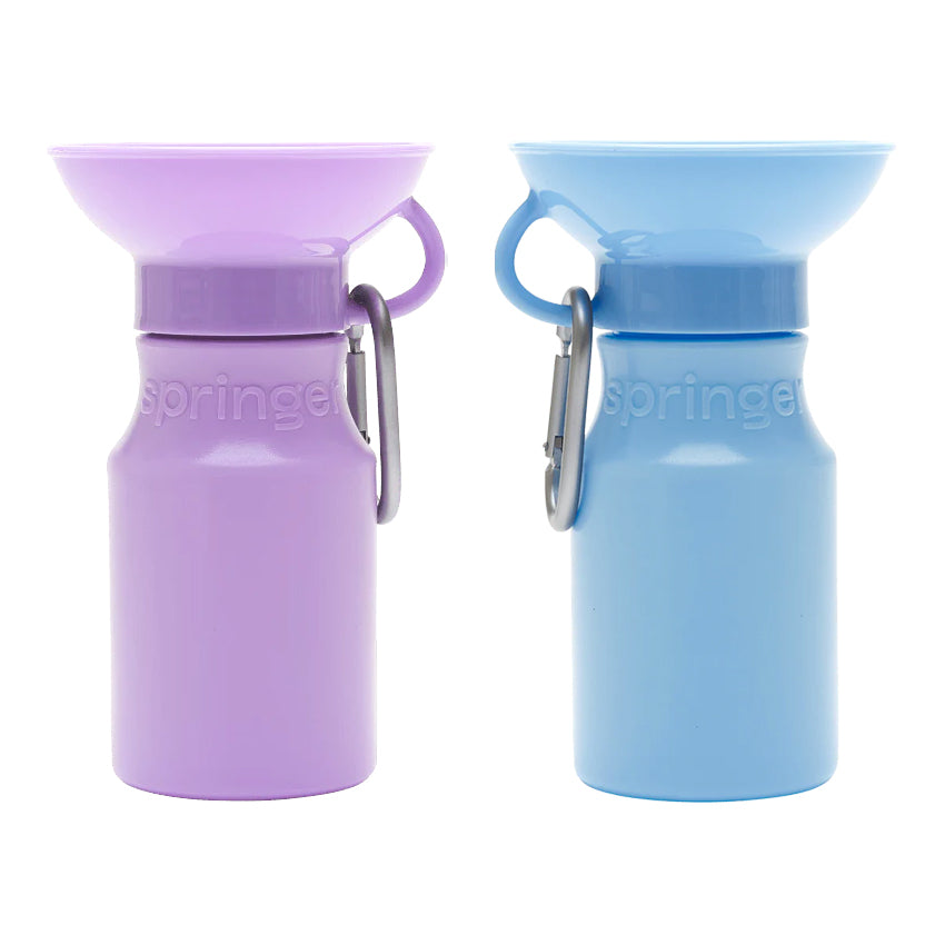 Springers' innovative travel dog bottle (formerly known as the AutoDogMug by Highwave) was designed for your dog to drink from the attached bowl without wasting a drop (or making a mess!) Just squeeze the bottle and water fills the bowl. Release your squeeze when your dog is done drinking and voilà — the excess water drains back into the bottle!