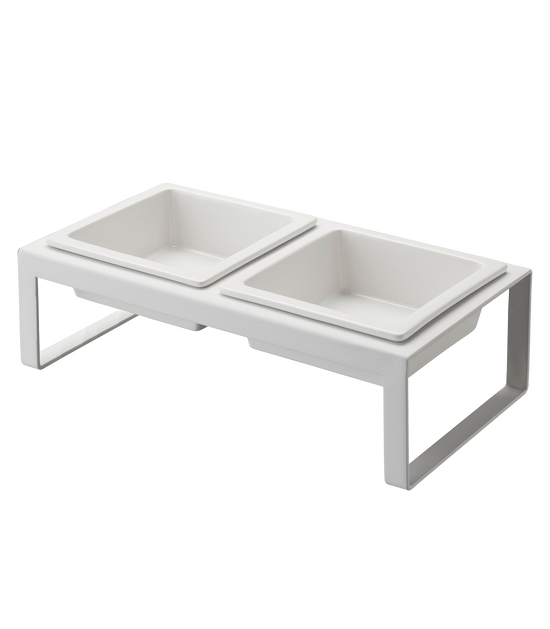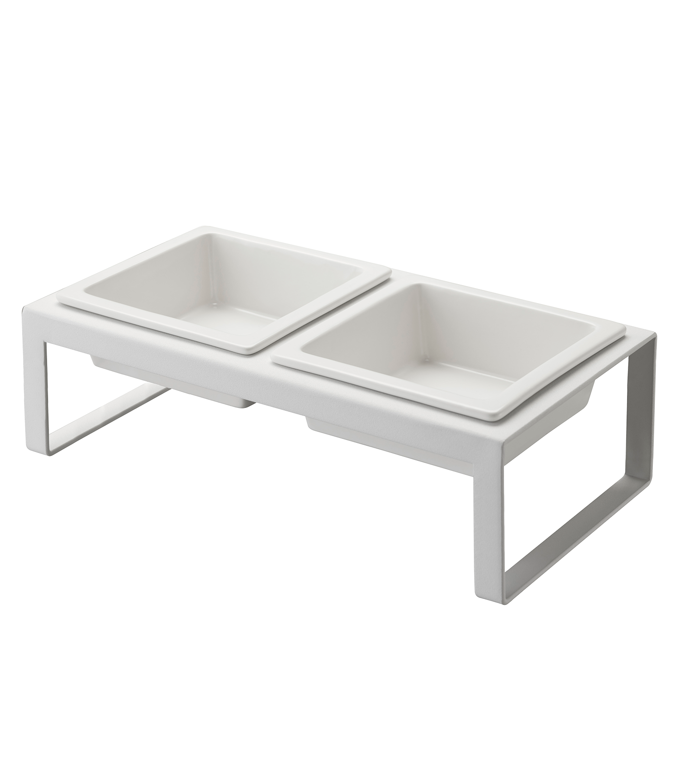 PET FOOD BOWL + STAND: Satisfy your cat or small dog's hunger and thirst as well as your sense of style. The added height of the stand is perfect for pets who like to eat with some distance from the ground. THOUGHTFUL DESIGN: The ceramic bowls fit neatly into the sturdy metal frame with easy removal for washing, and padded feet help keep the stand in place. NON-TOXIC MATERIALS: The ceramic bowls are microwave safe, and free of lead and other toxins. CAPACITY: Each bowl holds roughly 10 fluid ounces, or 1.5 cups of water or food MATERIAL: Ceramic, Steel BRAND: Inspired by “small-space living” in Japan, Yamazaki creates truly unique, ultramodern products that are mindfully designed to make incremental improvements throughout the home and elevate quality of life. Yamazaki. Home, simplified.